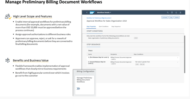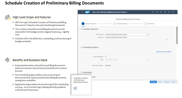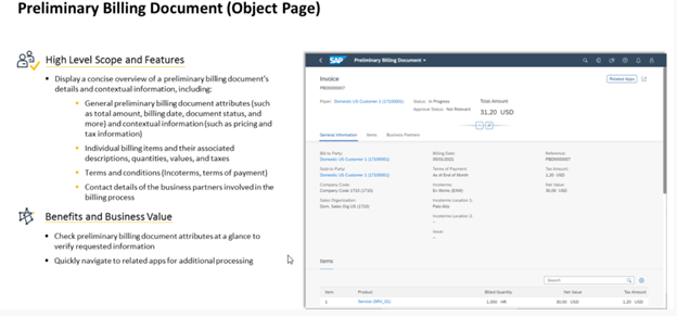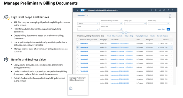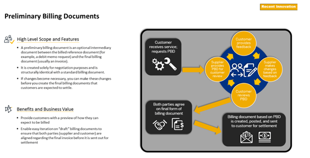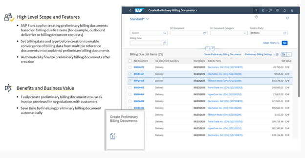 Preliminary billing documents for negotiation purposes based on items in the billing due list. You can change prices, attachments, and text for example. Output can be created for preliminary billing documents like final billing documents.